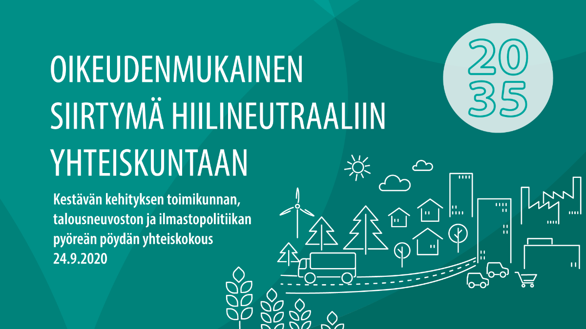 Kestävän kehityksen toimikunta, talousneuvosto ja ilmastopolitiikan pyöreä pöytä kokoontuvat torstaina 24. syyskuuta. Yhteiskokouksen teemana on oikeudenmukainen siirtymä hiilineutraaliin yhteiskuntaan. Tilaisuudessa pohditaan keinoja saavuttaa hallituksen hiilineutraaliustavoite vuoteen 2035 mennessä kestävällä ja oikeudenmukaisella tavalla.