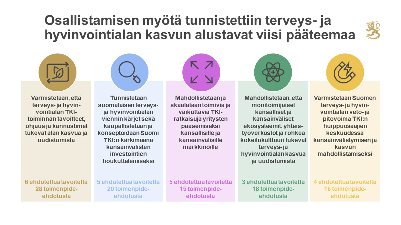 Laajan osallistamisen myötä on tunnistettu erityiset terveys- ja hyvinvointialan kasvun viisi teemaa, joiden toteutukseen sidosryhmäläiset ovat kehittäneet konkreettisia toimenpiteitä.