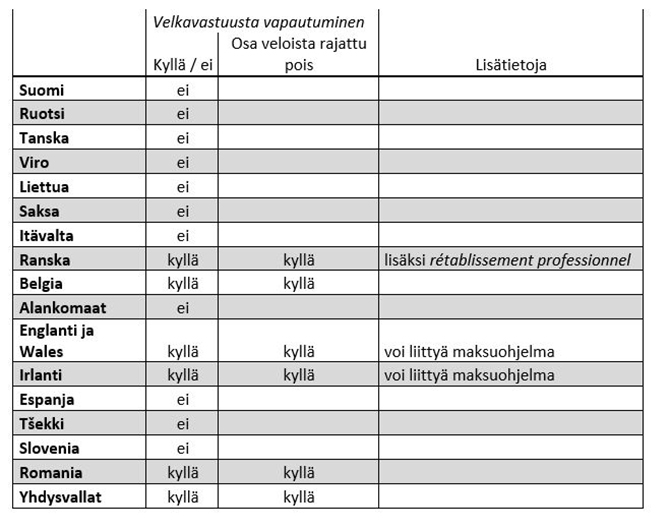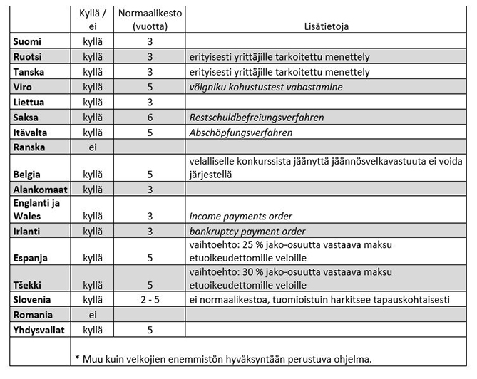 Oheiseen taulukkoon on koottu esimerkkejä, minkä maksukyvyttömyysmenettelyn kautta yrittäjän on mahdollista vapautua henkilökohtaisesta velkavastuustaan eri maissa.
