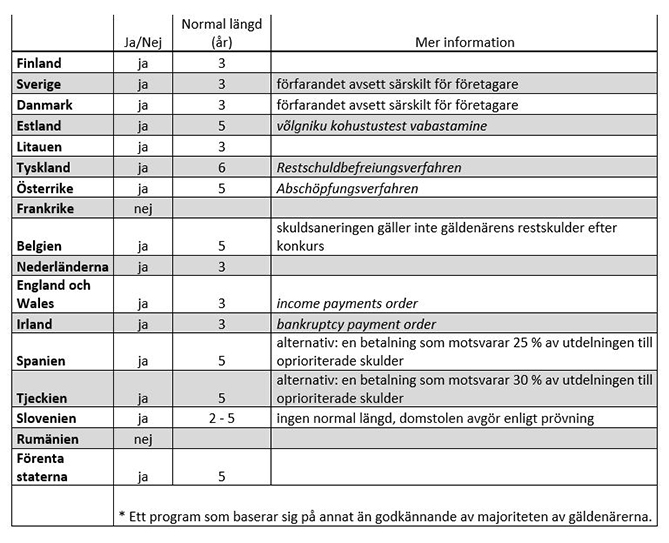 I nedanstående tabell presenteras exempel på insolvensförfaranden som kan tillämpas för att befria företagare från sina personliga skulder i olika länder.