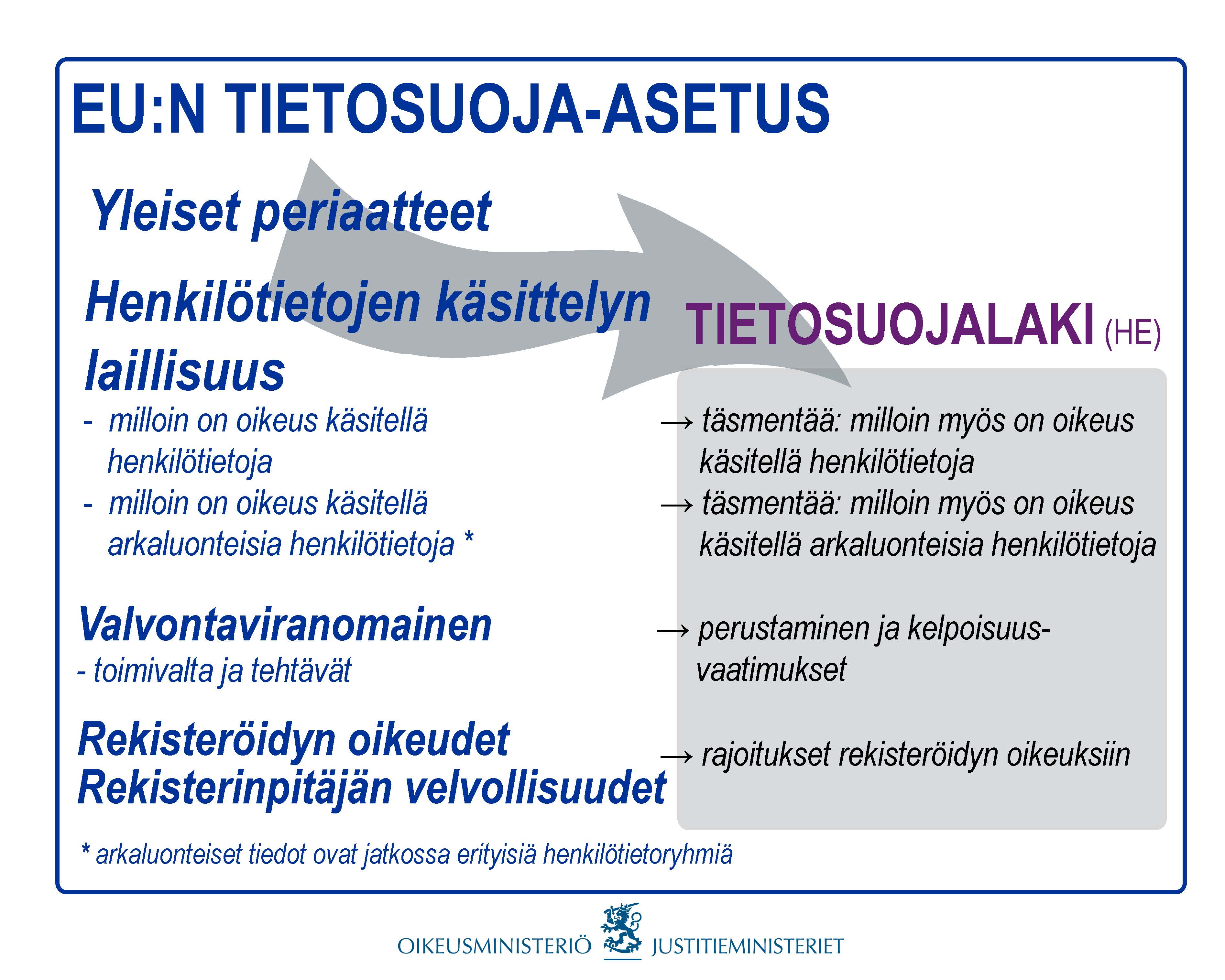 EU:n tietosuoja-asetus tulee sellaisenaan sovellettavaksi jäsenvaltioissa, mutta se jättää kuitenkin mahdollisuuden säätää tietyissä kysymyksissä poikkeuksia ja täsmennyksiä. Niistä säädettäisiin uudella tietosuojalailla. Tietosuojalailla säädettäisiin myös muun muassa valvontaviranomaisesta sekä eräistä henkilötietojen käsittelyyn liittyvistä erityistilanteista, kuten sananvapauden ja henkilötietojen suojan yhteensovittamisesta.