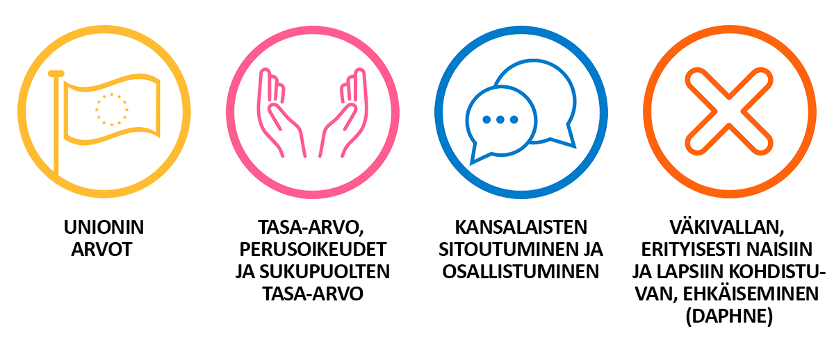 CERV-ohjelmalla on neljä erityistavoitetta, joiden pohjalta ohjelman rahoitushaut jakaantuvat teemoittain neljään eri lohkoon: