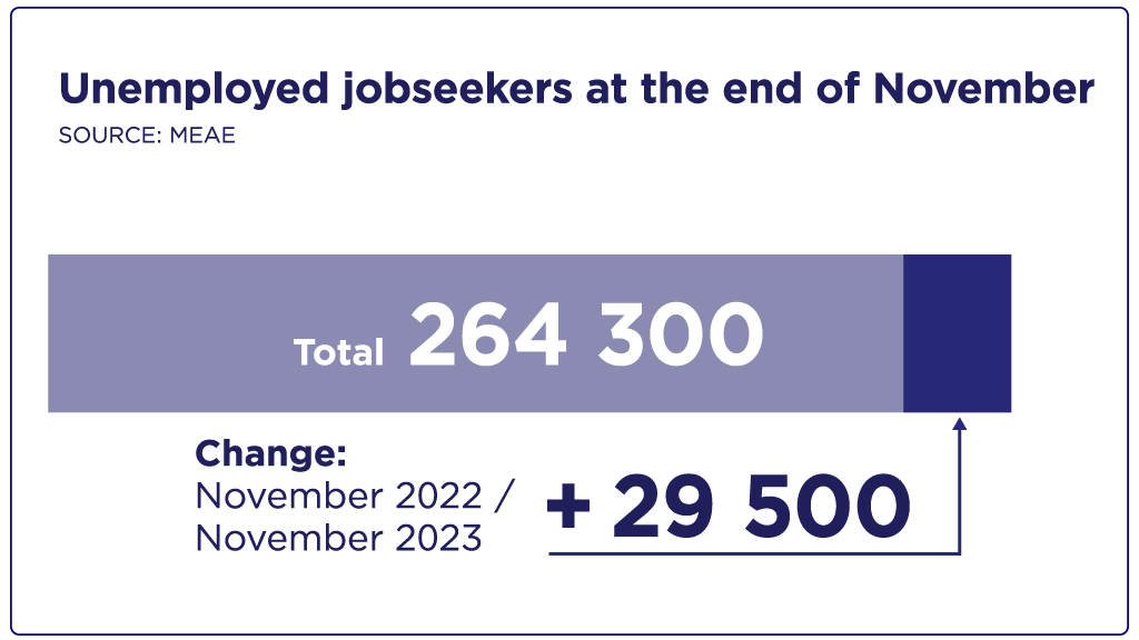At the end of November, the number of unemployed jobseekers totalled 264,300. This is 29,500 more than a year earlier and 8,200 more than in the previous month. These figures are from the Employment Bulletin of the Ministry of Economic Affairs and Employment.
