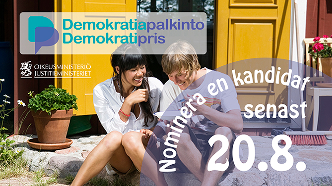 Temat för justitieministeriets Demokratipris 2018 är fostran till demokrati och mänskliga rättigheter. Priset på 10 000 euro kan delas ut till en aktör eller delas mellan flera aktörer som företräder det civila samhället. Kandidater kan nomineras till och med den 20 augusti.