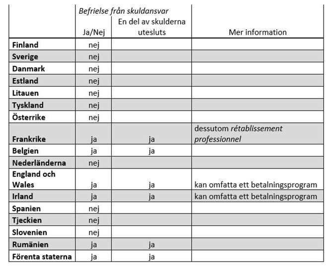 I nedanstående tabell presenteras exempel på insolvensförfaranden som kan tillämpas för att befria företagare från sina personliga skulder i olika länder.
