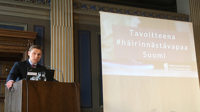 - Sexuella trakasserier handlar ofta om maktutövning, betonade justitieminister Antti Häkkänen i sitt tal vid seminariet #trakasserifritt som ordnades av justitieministeriet, Juristförbundet och Advokatförbundet i Helsingfors.