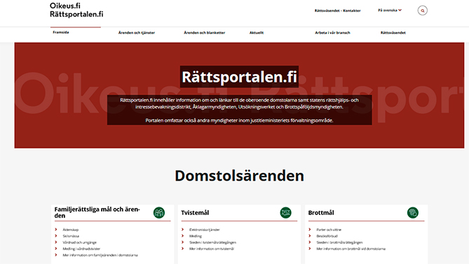 Webbtjänsten Rättsportalen.fi har omarbetats. Tjänsten innehåller information om rättsväsendet och länkar till oberoende domstolars och andra judiciella myndigheters webbplatser. Rättsportalen.fi samlar domstolarna, Åklagarmyndigheten, Utsökningsmyndigheten, Brottspåföljdsmyndigheten samt statens rättshjälps- och intressebevakningsdistrikt.